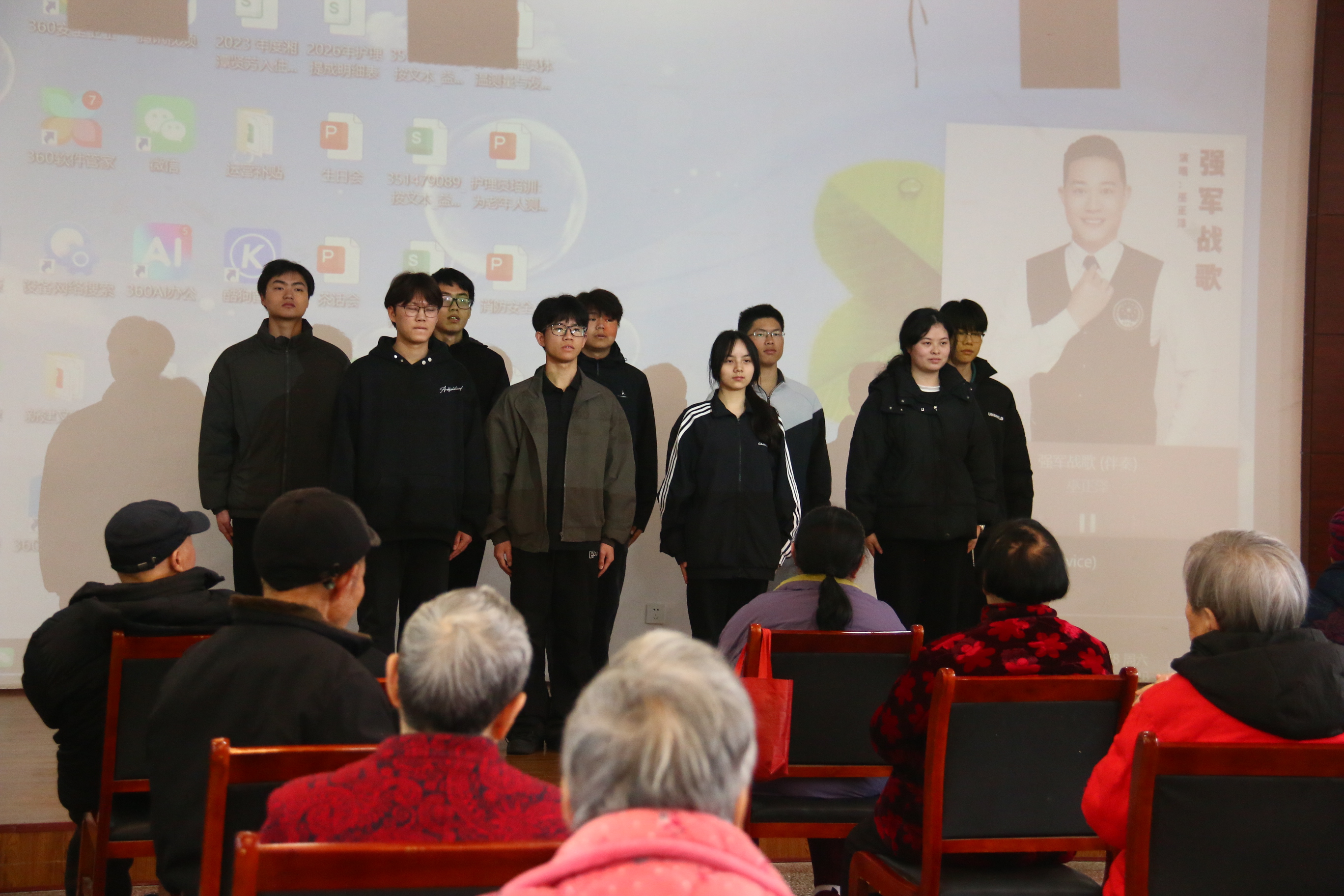 志愿者们走进老人房间,与老人们亲切谈心,倾听其生活趣事与过往经历,拉近彼此距离。文艺表演活动现场温馨融洽,志愿者们带来歌曲、舞蹈等节目,激昂的旋律、灵动的舞姿赢得老人们阵阵喝彩,《强军战歌》更将现场气氛推向高潮,为养老中心注入青春活力。志愿者们还为老人们送上精心准备的礼品,送上祝福并合影留念。