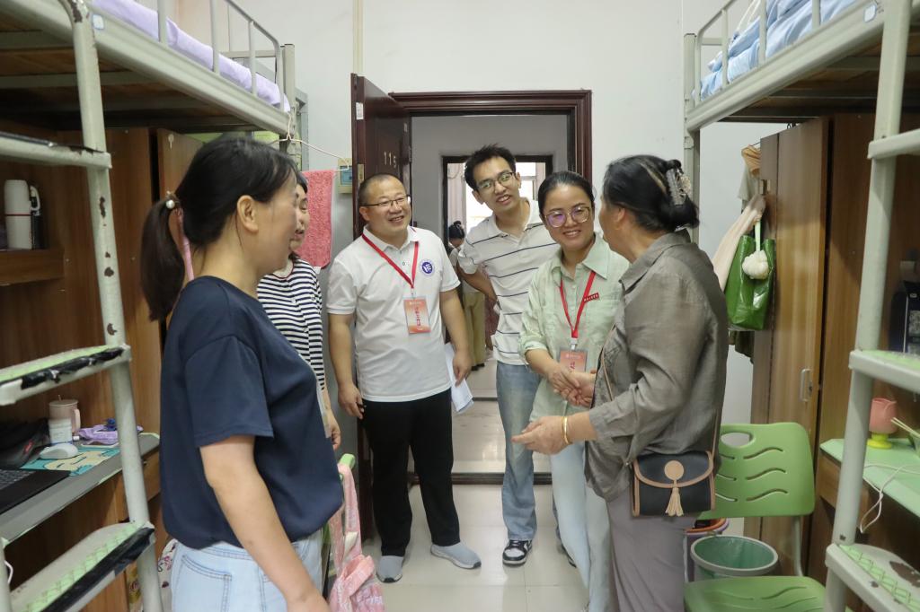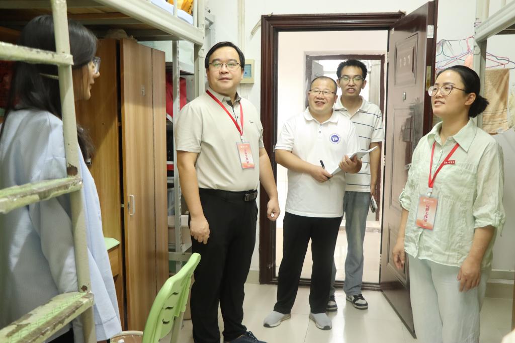 9月14日上午,张何、严明及全体辅导员、班主任深入宿舍,了解新生入住情况,帮助解决实际困难。走访中,院领导与新生亲切交谈,细致询问生活设施使用体验和初入大学的适应状态,并贴心分享集体生活技巧和作息建议。 特别强调宿舍安全,叮嘱上铺同学注意上下床安全,明确禁止使用大功率电器,帮助新生树立自我防范意识,共建安全、和谐的居住环境。