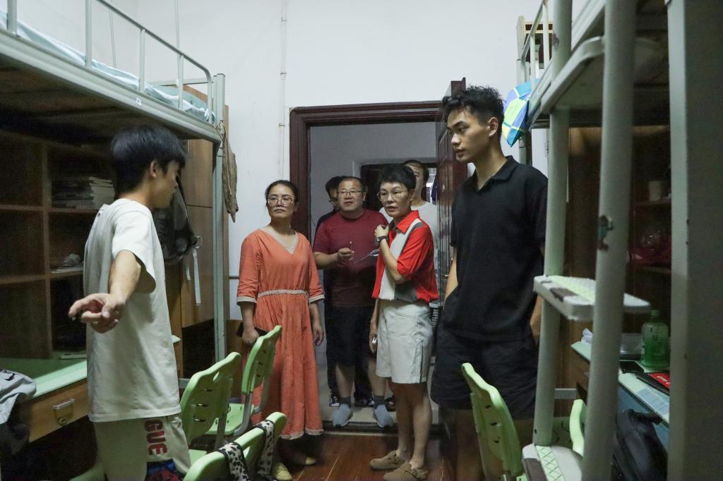 走访过程中,着重检查宿舍楼内卫生情况,同时对返校学生尤其及专升本新生进行亲切慰问,督促同学们保持宿舍整洁,培养良好卫生习惯,爱护洗衣房等公共区域的卫生。经过综一宿舍楼时,领导老师们特地前往自习室查看暑期留校学生的学习备考状态,了解学生们的实际需求。
