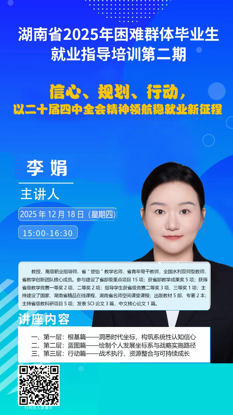 “湖南省 2025 年困难群体毕业生就业指导培训(第二期)”第四场于12月18日(下午)15:00—16:30开展