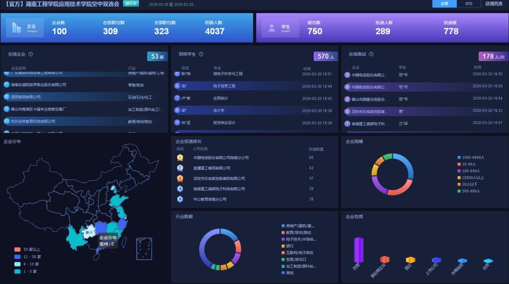 3月20日,春分之日,春暖花开,威廉希尔官网举办的首场空中双选会在云端展开。来自湖南、广深、江浙沪的100家企业,为毕业生提供了323个职位,4037个岗位。当天来到空中展会大厅的学生共570人,有289名学生投出778份简历,178名同学接受了企业的远程视频面试。
