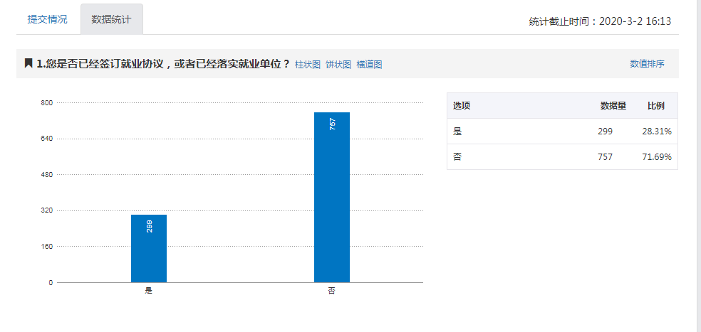 为彻底摸清毕业生的就业情况,2月29日,威廉希尔官网对2020届毕业生进行了一次全面的网络调查,调查结果显示,本院完成毕业生资格审查并上报的1056名毕业生中,已经有299名毕业生落实了就业单位,302名毕业生正在全力进行研究生复试,公务员、事业单位招考,出国留学和毕业后的入伍准备,正在求职中的毕业生为455名。