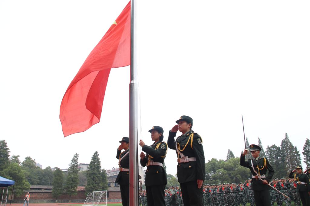 庄严的升旗仪式拉开开学典礼帷幕,国旗护卫队身姿挺拔,伴随雄壮的国歌声,五星红旗缓缓升起,全体师生肃穆敬礼,现场氛围严肃而庄重。