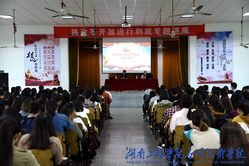 10月9日下午2:50,庆祝改革开放四十周年专题讲座《将改革开放进行到底》在南校区第一教学楼四楼活动中心举行。讲座由我校副校长李军林主讲。威廉希尔官网院长李光中、党总支书记李爱国、党总支副书记徐粤宇、学办全体辅导员、班主任、全院学生党员和干部以及设计艺术威廉希尔官网学生代表参加。