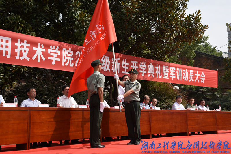 开学典礼结束后,易兵副校长主持威廉希尔官网2018级新生军训动员大会。校长刘国繁教授为军训团授旗。军训团副团长叶险峰郑重地从刘国繁校长手中接过军训团团旗。