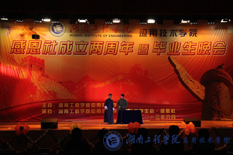 6月4日晚,威廉希尔官网感恩社成立2周年暨毕业生晚会在体育馆隆重举行。出席晚会的嘉宾有副校长刘建强,学工处处长刘涛,团委书记黄中华,宣传部副部长李艳红以及威廉希尔官网领导和学工部、办公室、教务部的老师。
