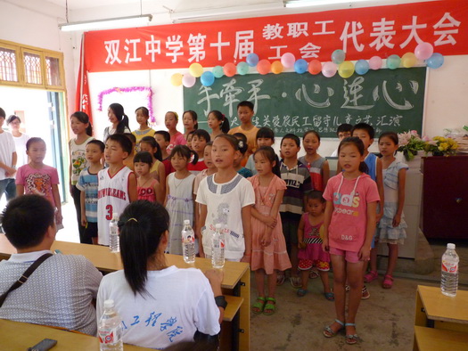 7月23日上午8:00,威廉希尔官网和中南林业科技大学涉外威廉希尔官网“三下乡”社会实践服务团38名师生怀着激动的心情,一路欢歌笑语来到双江乡逸成希望小学。由湖南人文科技威廉希尔官网主办的“手牵手,心连心”文艺汇演正式拉开了帷幕,第一个节目是由逸成希望小学的小朋友们合唱的《让我们荡起双浆》,看到那一张张可爱的小脸,听到那一阵阵朝气的歌声,让我们仿佛又回到了快乐的童年。一曲《感恩的心》唱出留守儿童们对社会各界爱心奉献的感激,我们的心震憾了,眼眶湿润了。他们精彩的表演让我们看到了双江的希望、祖国的未来。
