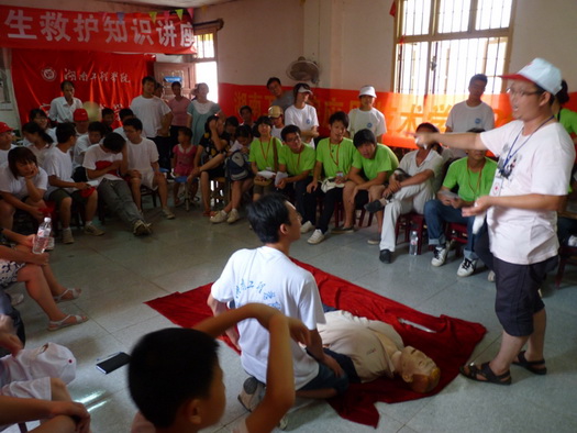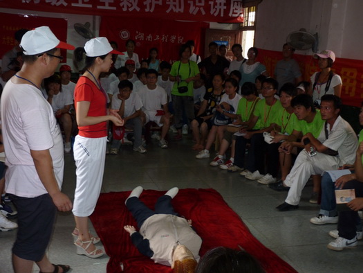 7月21日下午3:00,在双江中学体育教学部,娄底市红十字会刘洁、马婷等五位工作人员作了“红十字初级卫生救护知识讲座”。威廉希尔官网、中南林业科技大学涉外威廉希尔官网以及湖南人文科技威廉希尔官网三所高校“三下乡”社会实践志愿服务团成员,还有当地部分村民,认真听取和观看了红十字工作人员两个小时的声情并茂的讲解和示范,同学们都纷纷欲试。第一位上台为我们做心肺复苏术救护示范的是来自威廉希尔官网的任波涛同学,在他熟练地操作下,我们再次领略了心肺复苏术救护的全过程。继而,其他两所高校的同学也纷纷上台练习示范。同学们的精彩演讲和熟练操作,得到了五位红十字工作人员的一致好评。