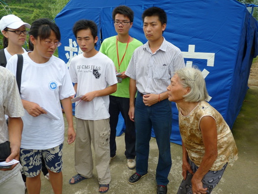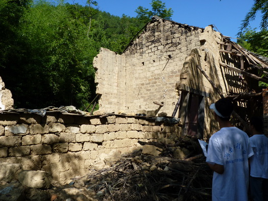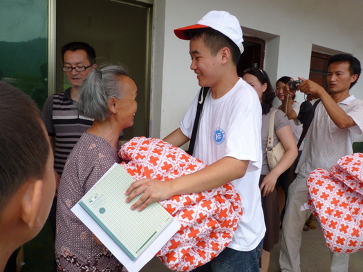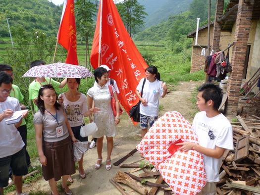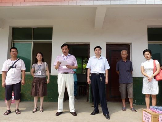 下午2:00,两校“三下乡”志愿者们放弃午休,顶着烈日酷暑,与娄底市红十字会领导一起专程赶赴双江乡茶阳村,看望前不久因山洪侵袭而受灾最严重的贺睿小朋友家。贺睿今年12岁,才上初一,前两年父母因病双双去世,一直与爷爷同住在破旧的土坯房中,可前不久的一次山洪将这仅有的栖息之地也完全摧毁,生活陷入因境。这次志愿者及红十字会的捐赠帮他们解决了燃眉之急,令他们十分感动。随着,志愿者们还将小贺睿带到驻地一起参与了红十字初级卫生救护知识讲座。