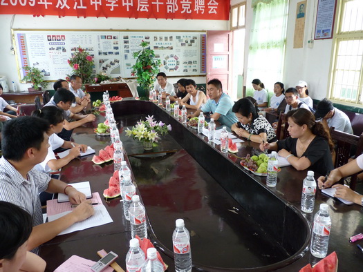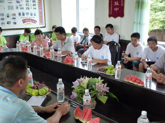 首先,聂乡长给介绍了双江乡的地理位置、面积、人口等基本情况,着重从农业、工业、生态旅游、党建的四个方面介绍了该乡的发展状况,总结了该乡近几年所取得的丰硕成果,并对“三下乡”服务团成员提出三点要求:一要进一步深入基层,进一步加深对“三农”的理解;二要以自身的经历正确地引导留守儿童的健康成长;三要结合专业知识给农民群众提出具有价值意义的思维方式与建议。接着,南老师、娄老师分别介绍了此次“文化宣传、社会调研、爱心扶助”等三项活动的主题内容。负责接待的校方及有关村支书表示将对大学生服务团队的各项活动提供最大的帮助与支持。
