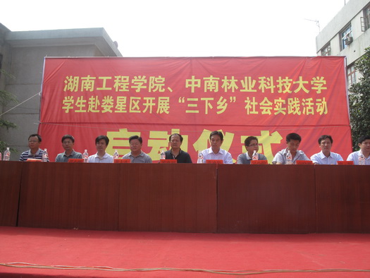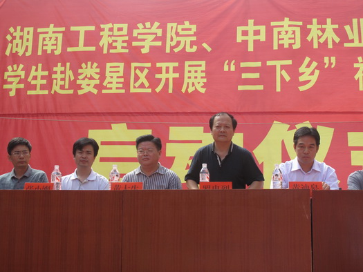 仪式上,万宝镇党委书记梁养贤代表万宝镇党委热烈欢迎我校和中南林业科技大学领导和同学的到来,期待大家能为当地的农村建设带来新思维、新观念,并预祝各团队的“三下乡”社会实践活动取得圆满的成功。随后,我校纪委书记罗忠烈发表讲话,罗书记充分肯定了大学生暑期“三下乡”活动的重要意义,鼓励大家把握机会,做好文化、科技、卫生下乡工作,促进社会主义新农村建设,充分学习实践科学发展观,将大学生的理论知识与“三下乡”的实践活动联系起来,以提高自身的思想政治素质。罗书记要求广大志愿者要深入农村基层,在不断提高自身的科学实践认识的基础上,切实为当地农村解决实质性的问题。最后,娄星区委副书记黄大生宣布“湖南工程威廉希尔官网、中南林业科技大学学生赴娄星区开展‘三下乡’社会实践活动正式启动。”
