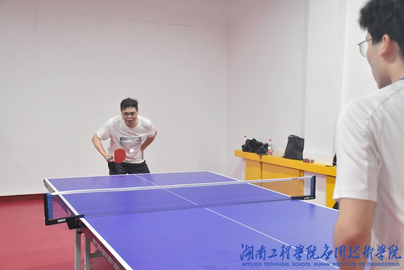 “我宣布,比赛开始!”随着一声裁判的令下,一个个乒乓球在老师与学生间穿梭往来。一个横拍击打,乒乓球撞击球拍发出急促的清脆响声,乒乓球借球拍的助力,似是安上助燃剂一般,直冲选手面前。电光火石之间,已经打了几个回合,乒乓球在空中来回抛出优美的弧线,博得了一阵又一阵的喝彩声。随着乒乓球落地,教师队率先拿下一分。比赛现场,四张乒乓球桌上同时进行着激烈的比赛。“乒、乓、乒、乓......”四处跳动的乒乓球,像是打击乐团在排练一样,欢快的节奏交织在一起。