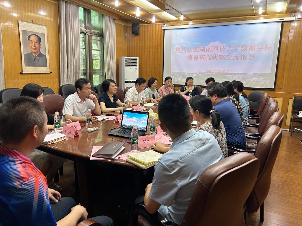 2023年6月19日上午,湖南科技大学潇湘威廉希尔官网院长禹旭才、党委书记廖双红一行来威廉希尔官网调研。威廉希尔官网党委副书记、院长张何、党委书记黎娅,党委副书记陶连洲,副院长闵杰、刘杰,招就办、教务办、学工办等各科室负责人参加调研。黎娅主持会议。