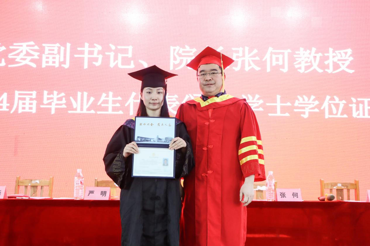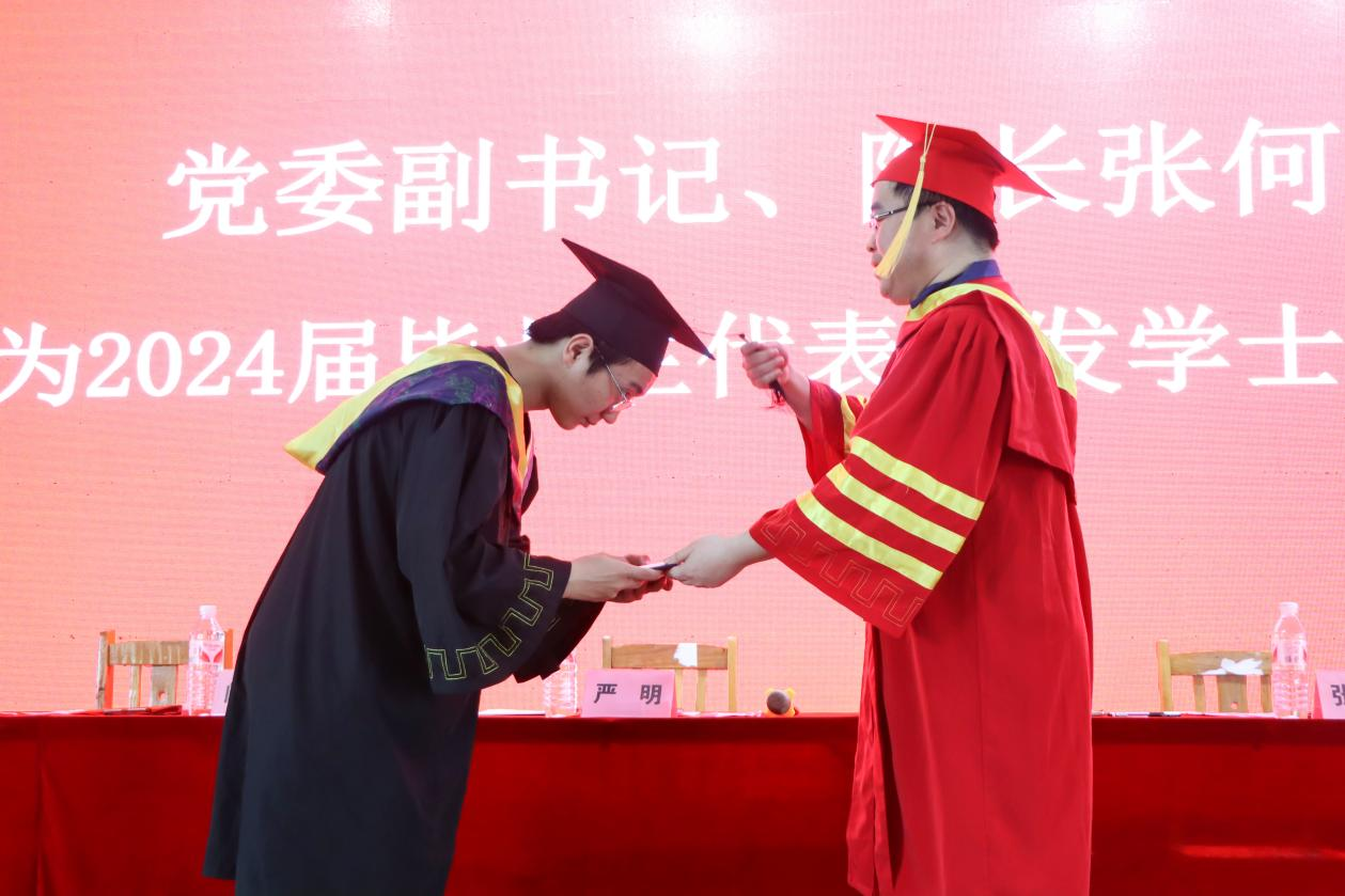 闵杰宣读《关于授予威廉希尔官网2024届毕业生学士学位的决定》后,隆重的颁发学位证书环节正式开始。伴随着激扬的音乐,毕业生代表一一上台,张何为2024届毕业生代表扶正流苏,颁发学位证书,并合影留念。