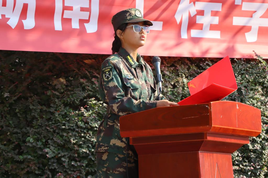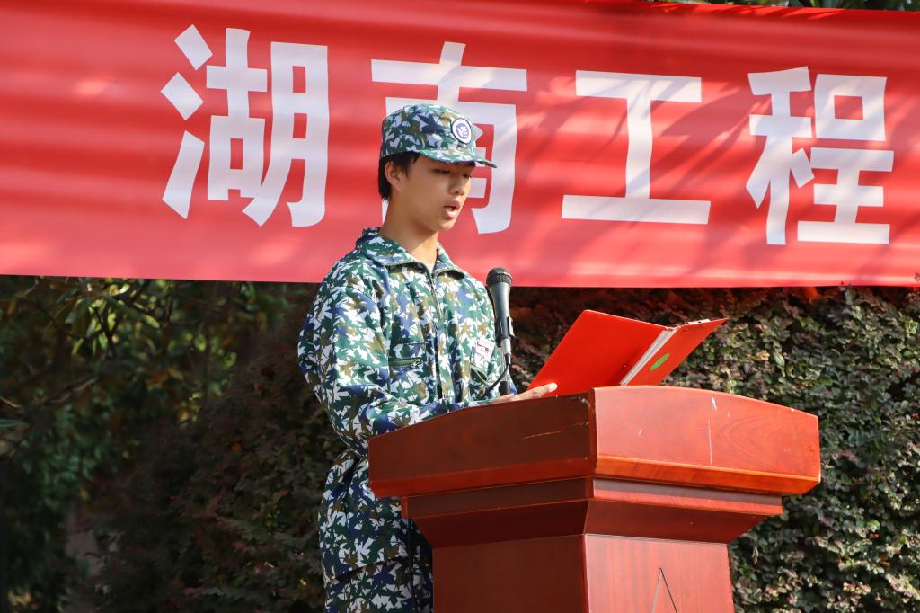 电气工程2482班申志康作为新生代表发言。他回顾了军训期间的点点滴滴,分享了与战友们并肩作战的难忘经历,表达了对教官的感激之情,他号召同学们将军训中的精神品质带到学习中,迎接未来的挑战与机遇,成为更好的自己。