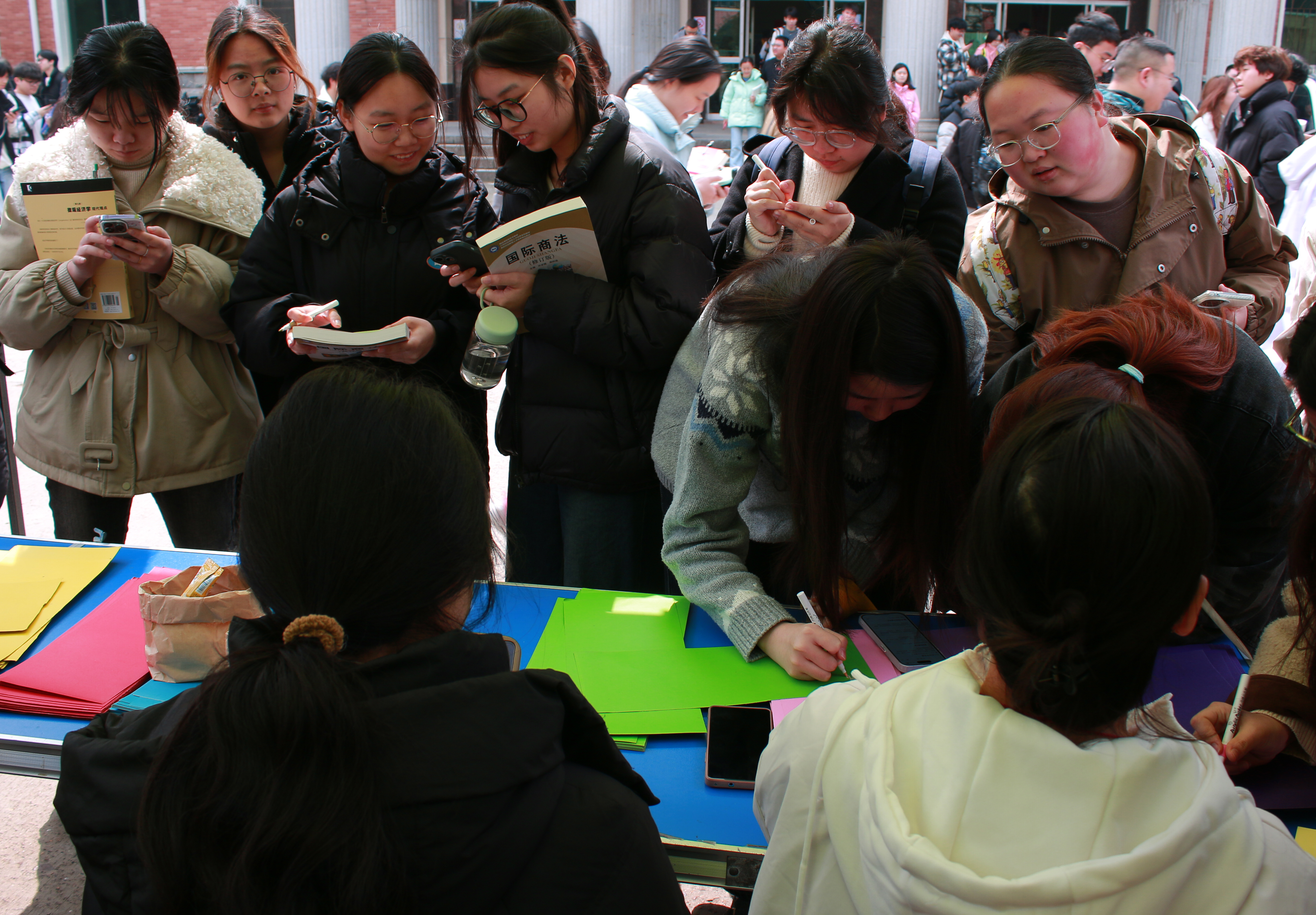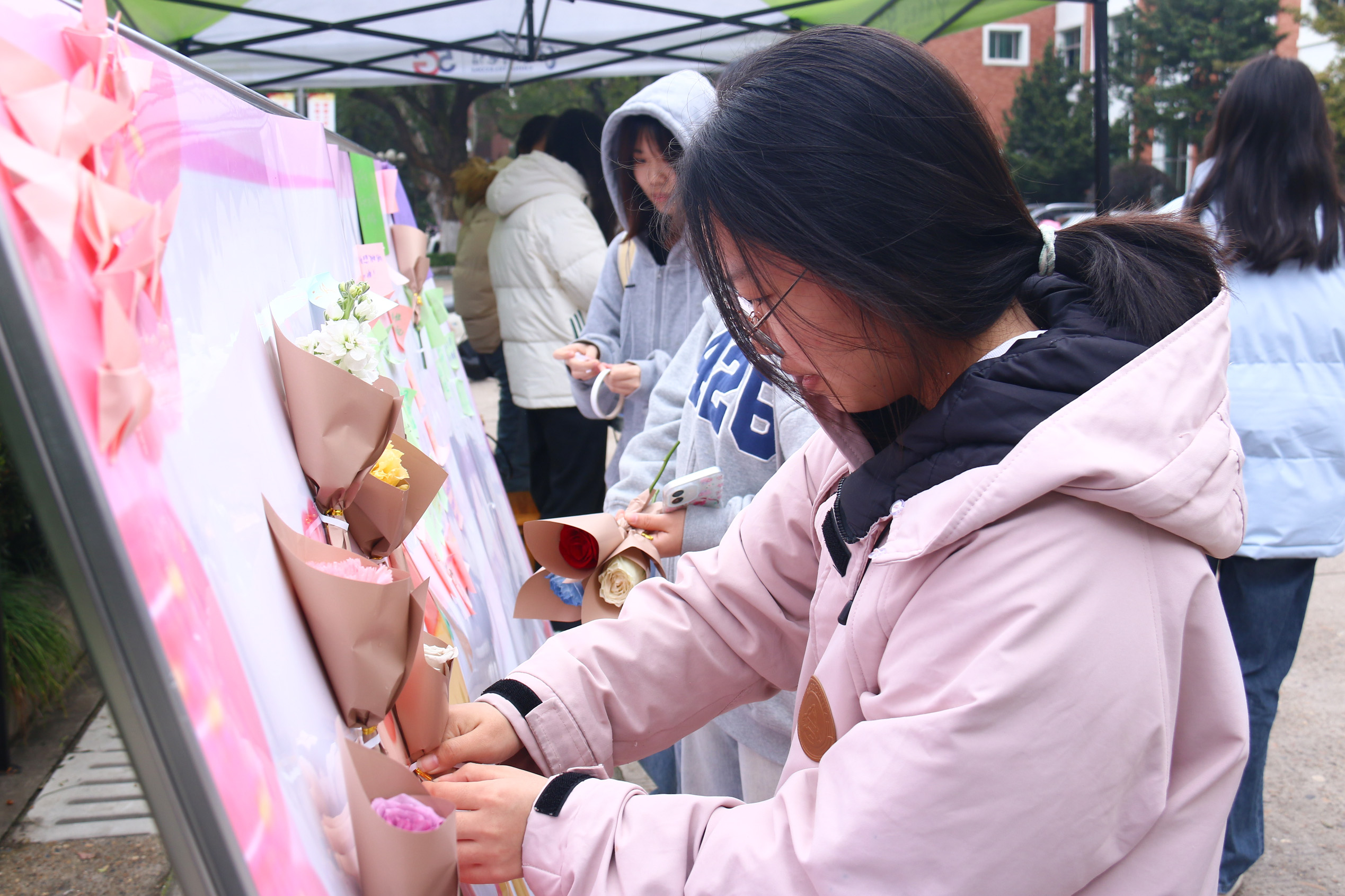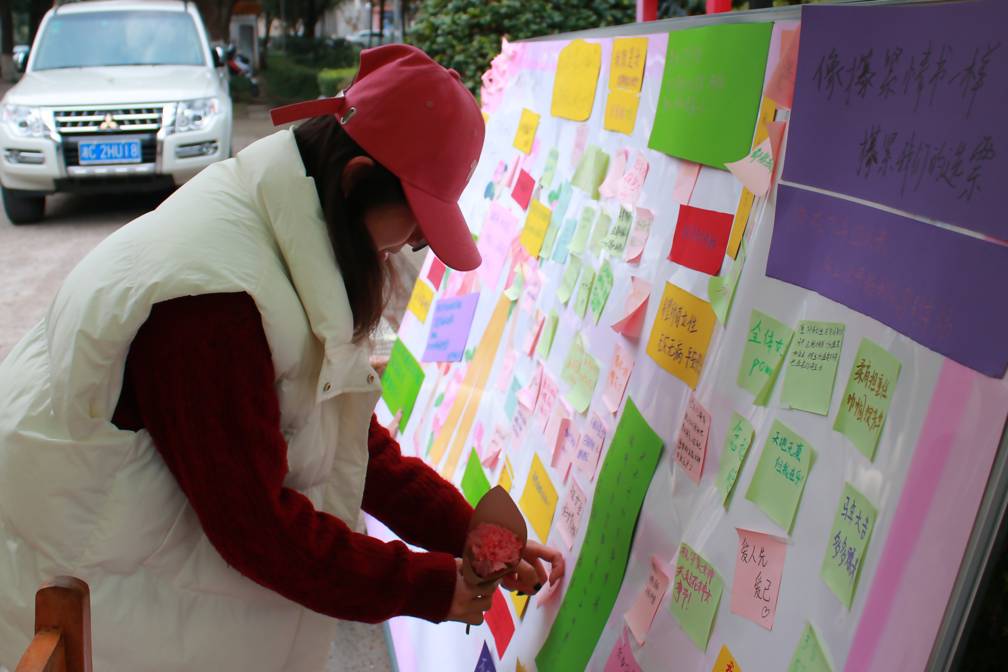 上午九时活动正式开始,同学们陆续赶来,展板前很快聚集起人群。现场备有彩色卡纸、便签和彩笔,大家在志愿者引导下写下祝福:"愿你不被生活为难,事事有底气,事事能安心!""温柔有骨、独立有光、不被定义、无限可能,妇女节快乐!"写满祝语的便签被逐一贴上展板,同学们领取鲜花糖果,在海报前合影留念,定格美好瞬间。
